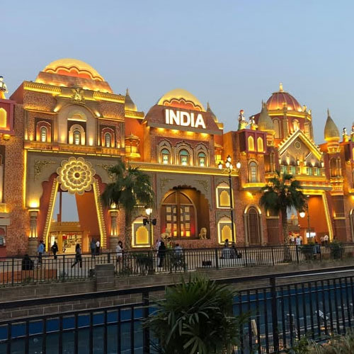 The Indian pavilion typically ranks among the largest at Global Village, reflecting India’s vast diversity. Architecturally inspired by Rajasthani havelis with intricate jali screens or South Indian temple gopurams adorned with stucco deities, the structure immediately signals its cultural identity through vibrant colors and sculptural abundance.